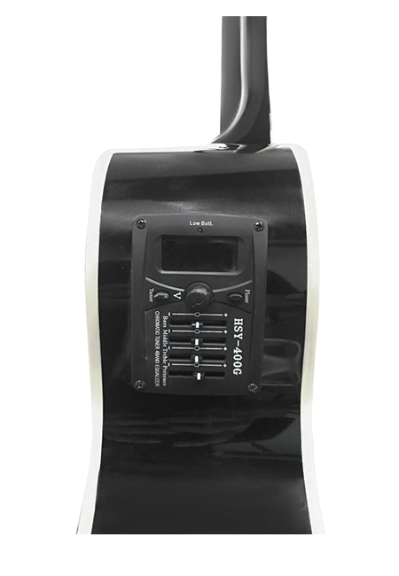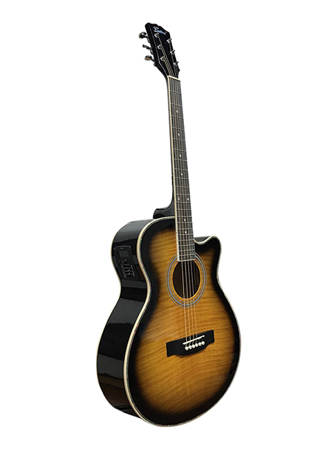 – Guitarra electroacústica con cuerdas de metal modelo MJG-304CPEQ. Presenta un diseño atigrado con tono café sombreado